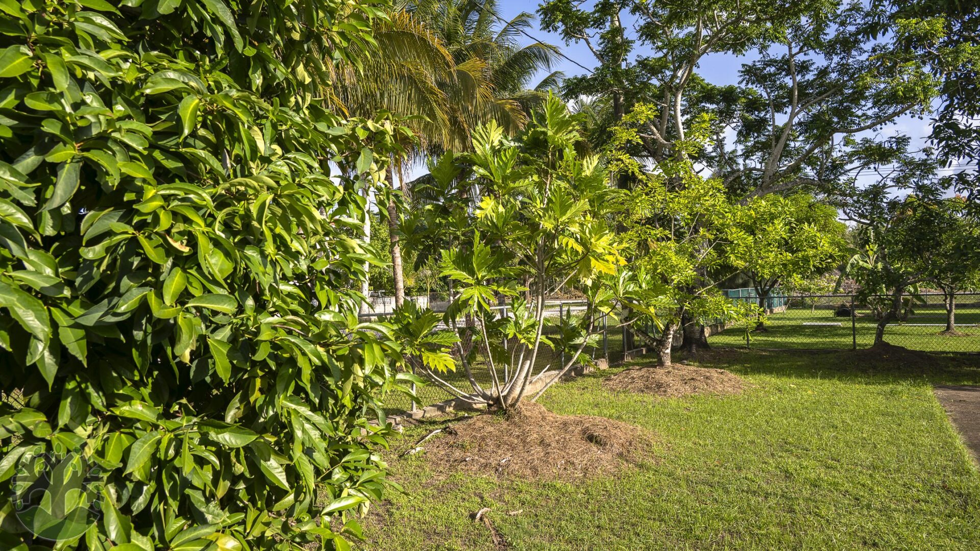 Fruit trees include: soursop, mango (2), avocado, sapodilla, starfruit, molly apple, guava, lime, orange, ackee, breadfruit, golden plum, mamey, moringa, and eight (8) coconut trees—a true tropical garden paradise!