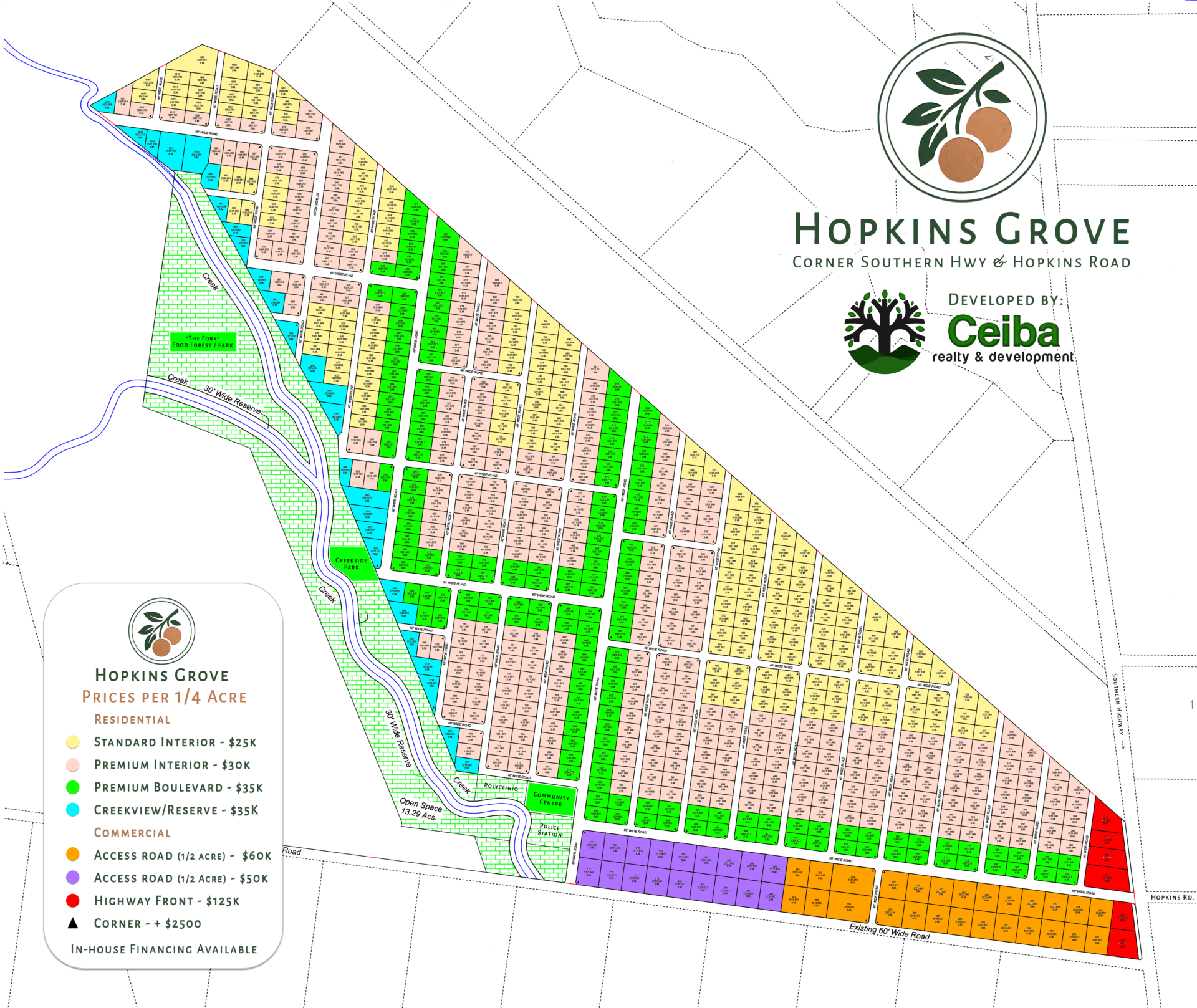 The Hopkins Grove Community was brought about by the idea that for many hard-working individuals especially those driving the local economy and tourism sector within the village the dream of owning property near the coast was becoming increasingly out of reach. Just as the team at Ceiba Realty recognized the immense potential of the Hopkins Junction, we are passing this superb opportunity on to our people to bring them accessible coastal land where opportunity meets the sea. Our vision is to cultivate a vibrant, multi-use hub: a master-planned community designed not just for affordable home ownership, but as a thriving ecosystem for short-term rentals, local commerce, and new businesses, all lying just 5 minutes from the beautiful beaches of Hopkins.